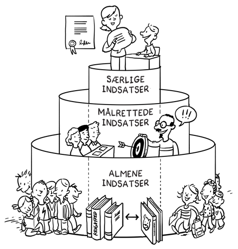 De tre indsatsniveauer er illustreret i figuren. En væsentlig pointe, der knytter sig til figuren, er, at personer, som har behov for særlige indsatser, også har behov for gode almene indsatser i klasseundervisningen og gode målrettede indsatser organiseret som hold- og gruppeundervisning.